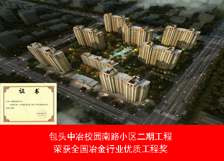 中國二冶承建的包頭昆區校園南路中冶置業住宅小區分一期和二期。一期項目總建筑面積193689.75平方米,地上建筑面積145800平方米,地下建筑面積47889.75平方米,人防建筑面積12136.12平方米;其中住宅132645.62平方米,配套商業12032.85平方米,公共服務設施517平方米。項目組成方式分為A01至A17共17棟住宅樓,商業一、商業二及地下車庫起重1號至11號樓為二類高層,7號、8號、12號、13號、14號、15號、16號、17號樓為多層住宅,地下車庫為1類汽車庫。結構采用鋼筋混凝土剪力墻結構(商業一、商業二級地下車庫為框架結構),抗震設防烈度8度。地下部分耐火等級為一級,地上部分為二級;地下室部分及屋面防水等級均為二級。二期項目總建筑面積97246.9平方米,地上建筑面積78557.94平方米,地下建筑面積18688.96平方米,其中住宅分為1號、3號、5號、8號樓4棟住宅樓,C1、C6為商業,建筑特點主樓為鋼筋混凝土剪力墻結構,商業及地下車庫為框架結構,1號樓地上層數27層,3號樓地上層數17層,5號樓地上27層,8號樓地上27層。結構抗震等級8度設防,人防等級核6級,建筑物防火等級一級。