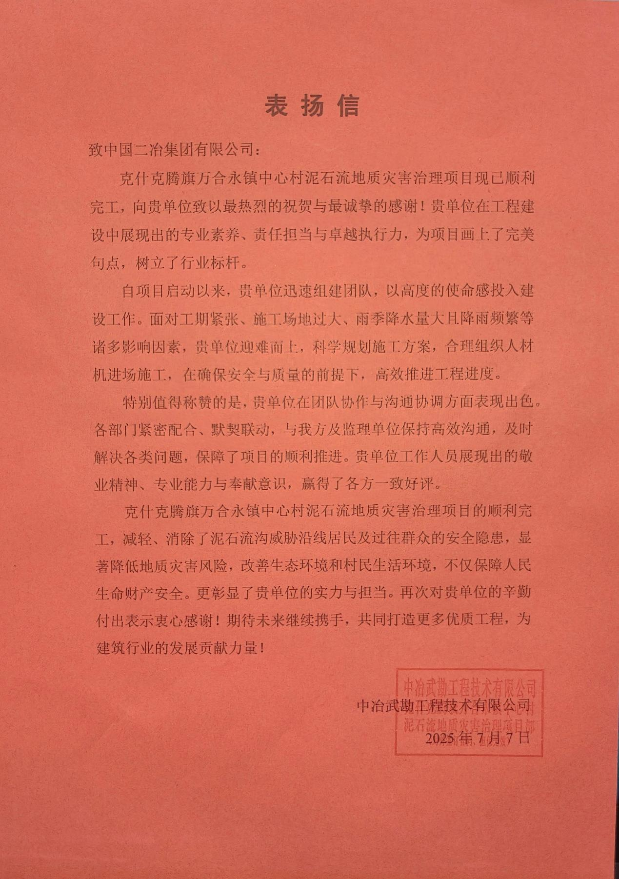 7月7日,中國二冶收到中冶武勘工程技術(shù)有限公司表揚(yáng)信,表揚(yáng)中國二冶在克什克騰旗萬合永鎮(zhèn)中心村泥石流地質(zhì)災(zāi)害治理項(xiàng)目建設(shè)中展現(xiàn)出的卓越專業(yè)素養(yǎng)、高度責(zé)任擔(dān)當(dāng)和強(qiáng)大執(zhí)行力,為項(xiàng)目的順利完工和取得顯著成效作出了重要貢獻(xiàn)。