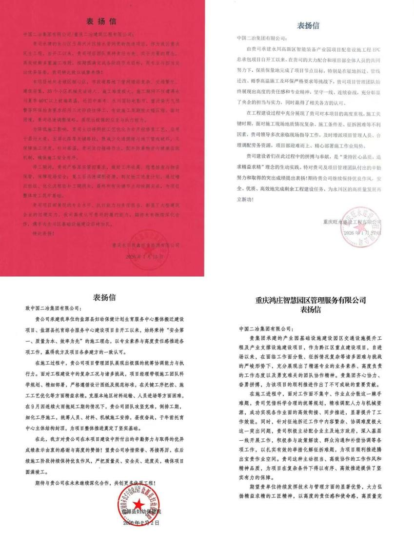 重慶旺永建設(shè)工程有限公司在信中指出,中國二冶承建的永川高新區(qū)智能裝備產(chǎn)業(yè)園項(xiàng)目,面臨征地拆遷、管線遷改、雨季高溫施工及嚴(yán)格環(huán)保要求等多重挑戰(zhàn),中國二冶項(xiàng)目管理團(tuán)隊(duì)始終秉持高度責(zé)任感與專業(yè)精神,堅(jiān)守施工一線、連續(xù)攻堅(jiān)克難,充分彰顯了央企的責(zé)任擔(dān)當(dāng)與綜合實(shí)力,也贏得了相關(guān)各方的廣泛認(rèn)可。